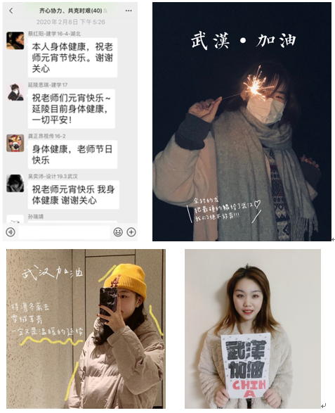 疫情发生以来,学院迅速成立疫情防控工作小组,统筹领导,积极宣传,从湖北到北京,虽相隔千山万水,但亲切的关怀拉近了师生之间的距离,辅导员、班导师通过电话、视频、微信等方式,一对一联系34名身在湖北的同学们,送去学校的关心和慰问。学院建立了“齐心协力、共克时艰”湖北同学微信群,每日做好健康情况记录的同时,及时关注每位同学的生活和学习,鼓励大家做好自我防护,坚定必胜信心、共同战胜疫情。远在湖北的建艺学子们100%承诺坚决听从国家安排、服从学校统一要求、积极响应学院号召,纷纷通过各种形式表达必胜的信念。