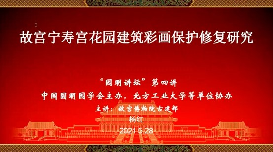 2021年5月28日下午,由中国圆明园学会园林古建分会主办,sjb世俱杯官方网站、上海交通大学设计学院建筑学系、南京信息工程大学艺术学院、湖南科技大学建筑与艺术设计学院、南阳理工学院建筑学院、中原大匠古建艺术研究院共同承办的圆明讲坛第四讲,邀请中国圆明园学会园林古建分会副会长兼彩画研究中心主任、故宫博物院杨红研究馆员作了题为《故宫宁寿宫花园建筑彩画保护修复研究》的学术讲座。讲座由中国圆明园学会园林古建分会副会长、秘书长宋国晓教授主持。本次讲座以云端会议的形式通过腾讯平台进行,来自5所承办高校及文保领域科研院所、企业的300余名师生、技术人员在线收看。