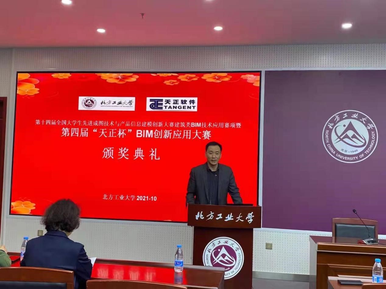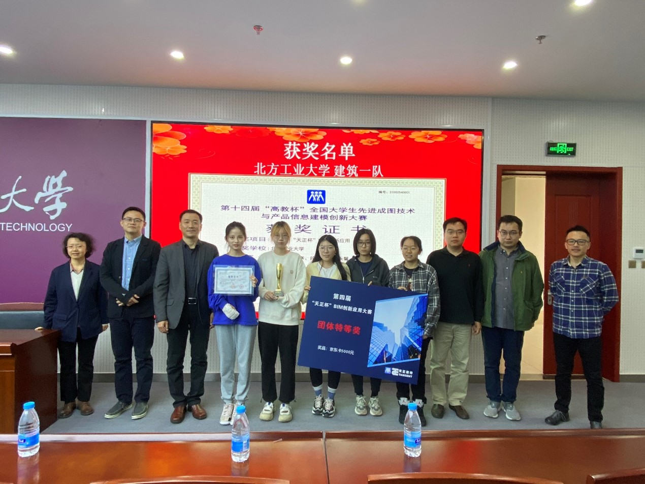 2021年10月14日,在7月份举办的第十四届全国大学生先进成图技术与产品信息建模大赛建筑BIM应用赛项暨第四届“天正杯”BIM创新应用大赛中,sjb官网sjb世俱杯官方网站组织的参赛团队取得了团体特等奖第一名的优异成绩。为激发广大同学的参赛热情,提高同学们的BIM应用水平,sjb世俱杯官方网站张勃院长、天正公司张志超总监与秦骥总监为指导老师和获奖同学(沈佳、张子寒、韩永馨、段文漪、何伊雯)颁发奖杯和获奖证书。